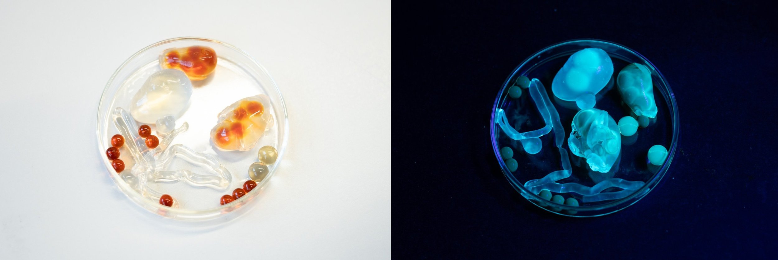 Like the ephemeral nature of UV fluorescence itself, a playful state is fleeting and occurs in peaks and valleys. Play requires intention to remain open to possibilities, and the groundwork to play must be laid to reach that liminal state between reality and fantasy. This means that not only physical requirements must be met (ie. ingredients, space, tools, information), but also psychological. Like any mammal, playful behaviour can only be initiated when one is adequately fed, healthy, and free from stress. Play is also best when shared, elongating the peaks through social cohesion, and eliciting feedback that broadens the lines of research enquiry.Through a workshop that engaged hcma employees as co-researchers in the material design process, we partook in a mutual delight of the material expressions of play developed during the residency.