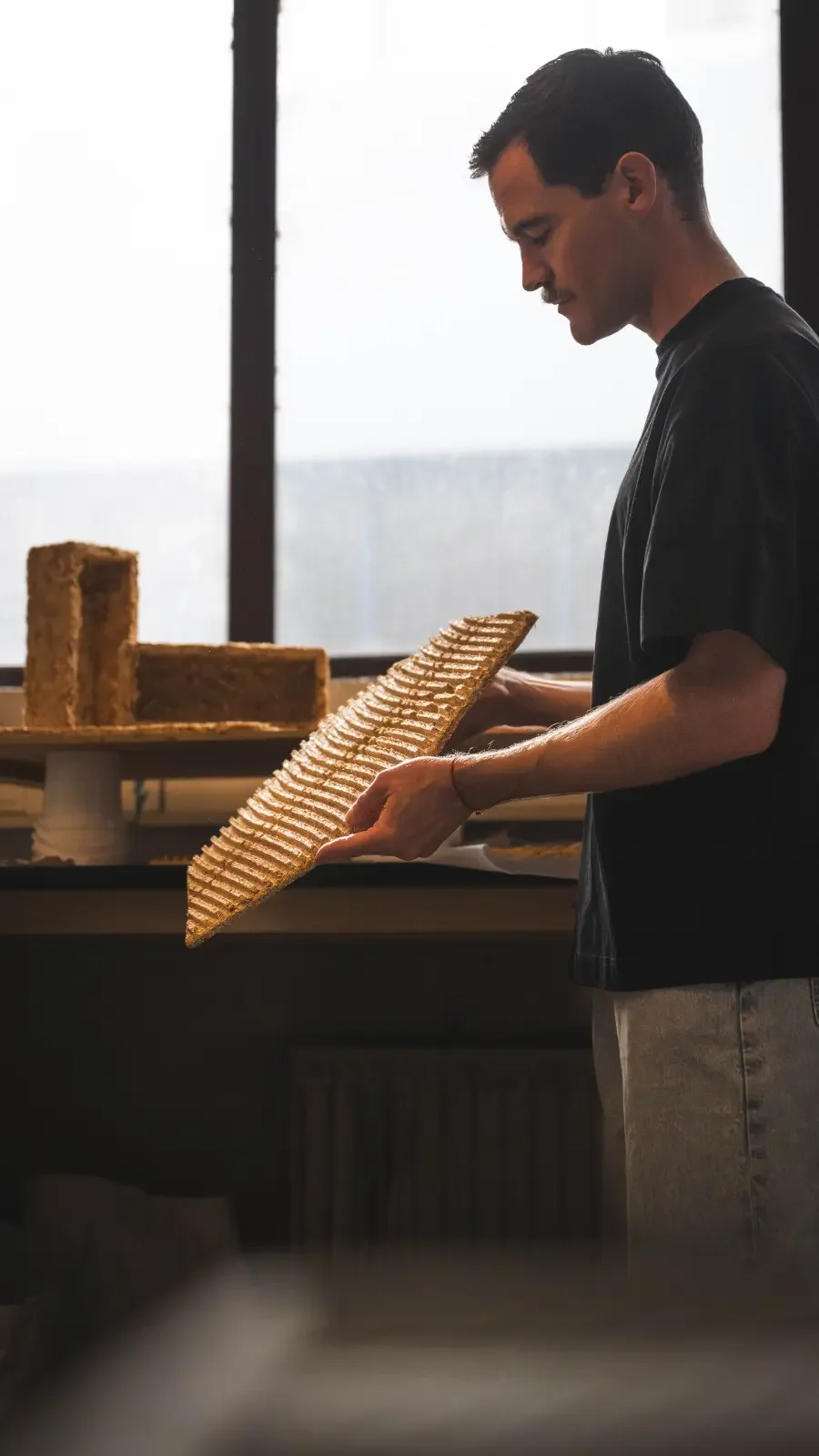 At Dutch Design Week 2025, several projects at Kazerne explored these shared processes of creation. Instead of chasing innovation for its own sake, they turned attention to origins — to the quiet intelligence of materials and the relationships that sustain them. From growing flax and reimagining wheat straw to sculpting rocks, these works ask what happens when we stop designing for materials and begin designing with them.