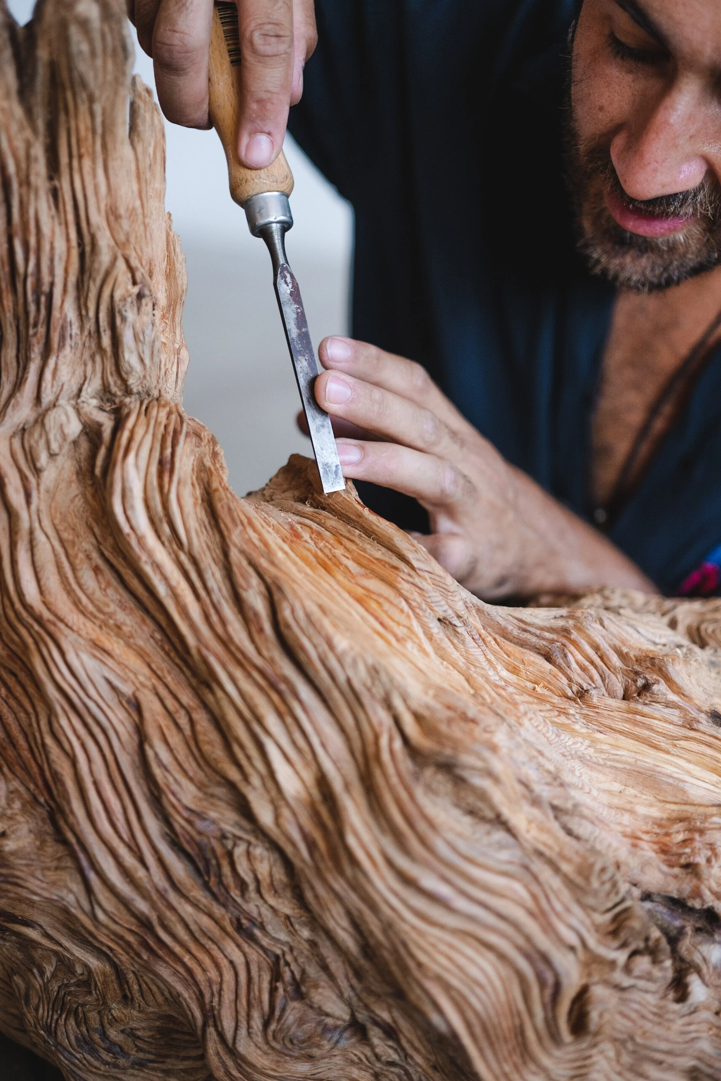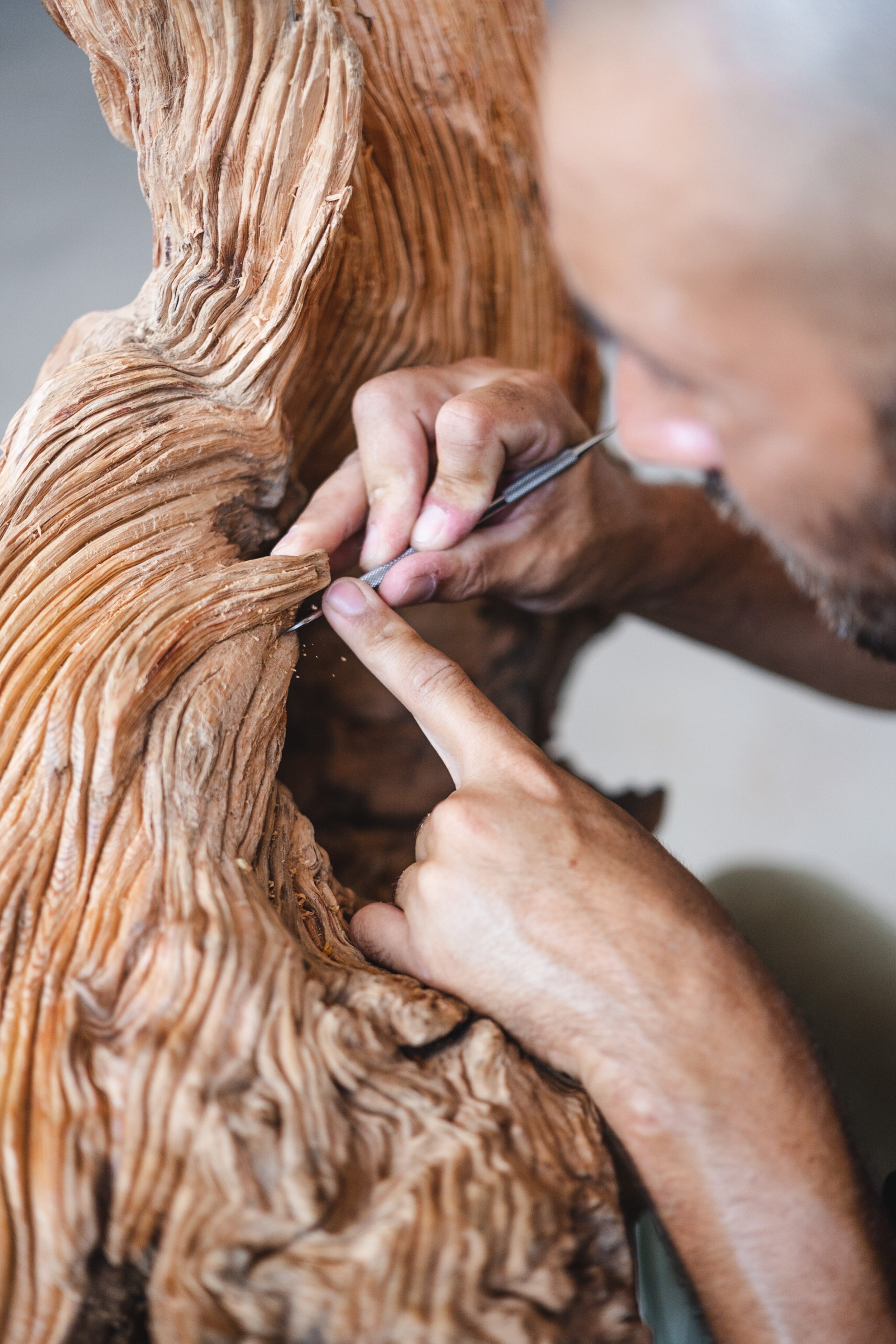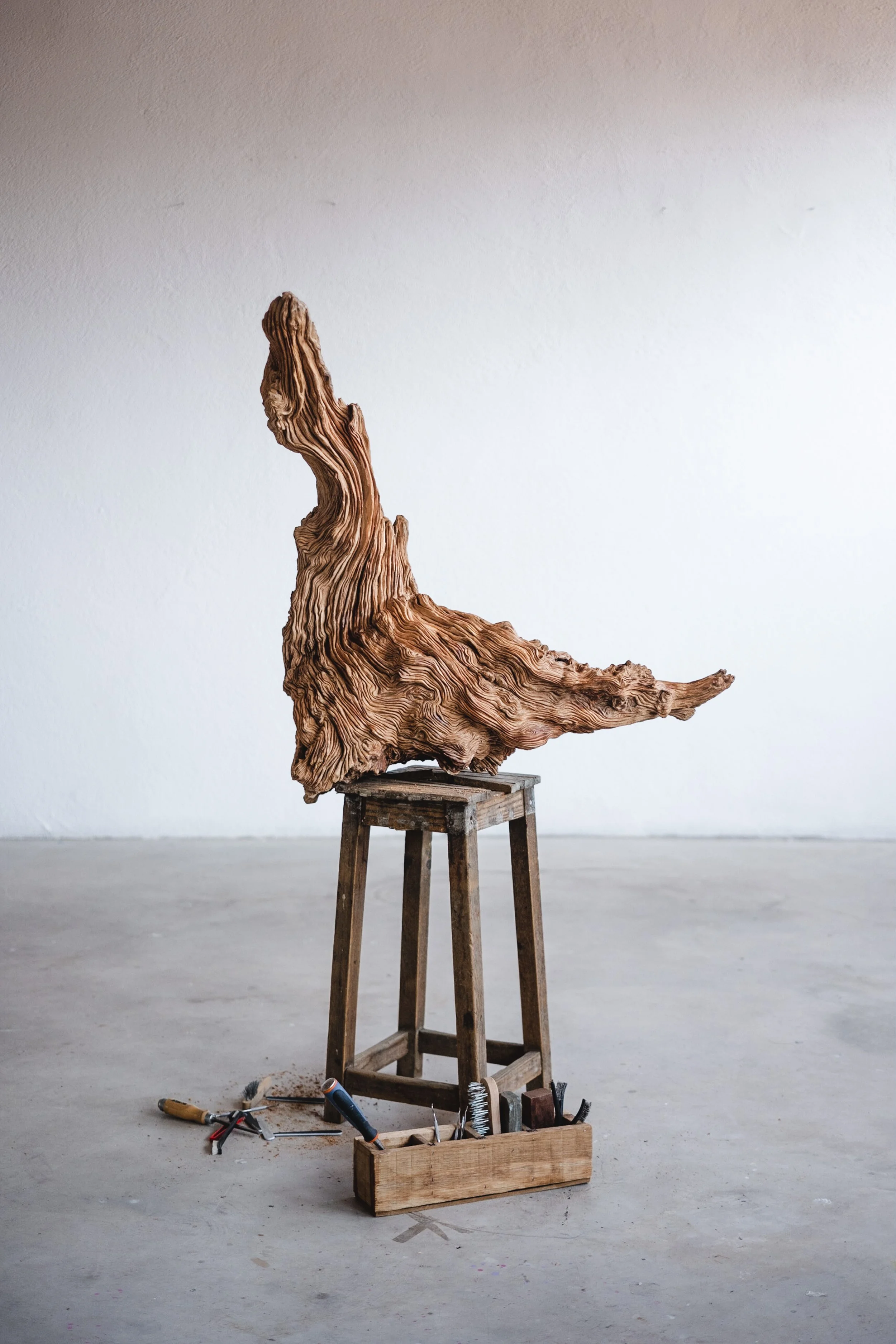 Back in his workshop, the pace slows even further. A single piece of wood may stay with him for years. He works into the secondary xylem—the tree’s memory bank—removing just enough to reveal its inner voice. He does not carve to impose; he waits, listens, and intervenes only when the material allows.
