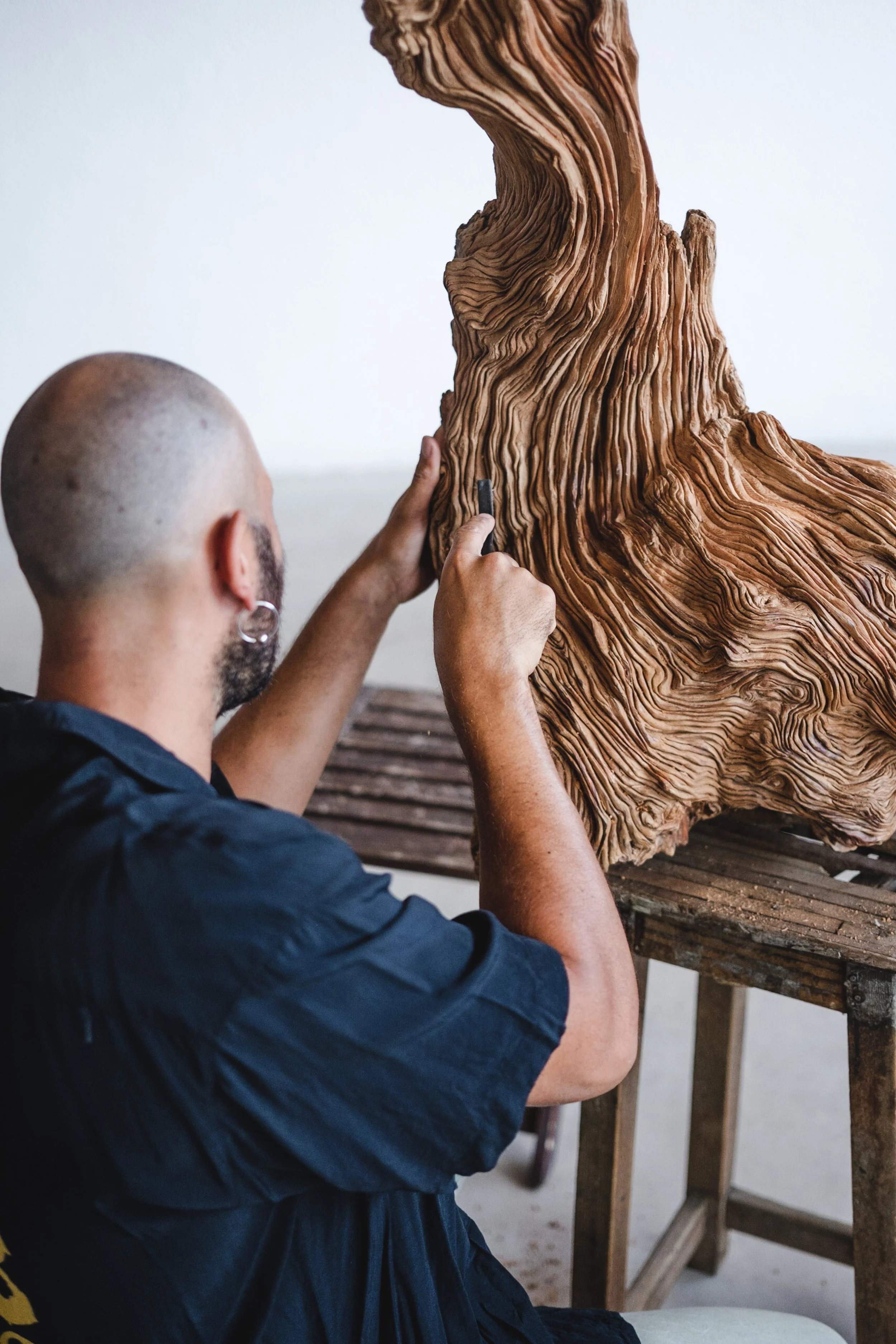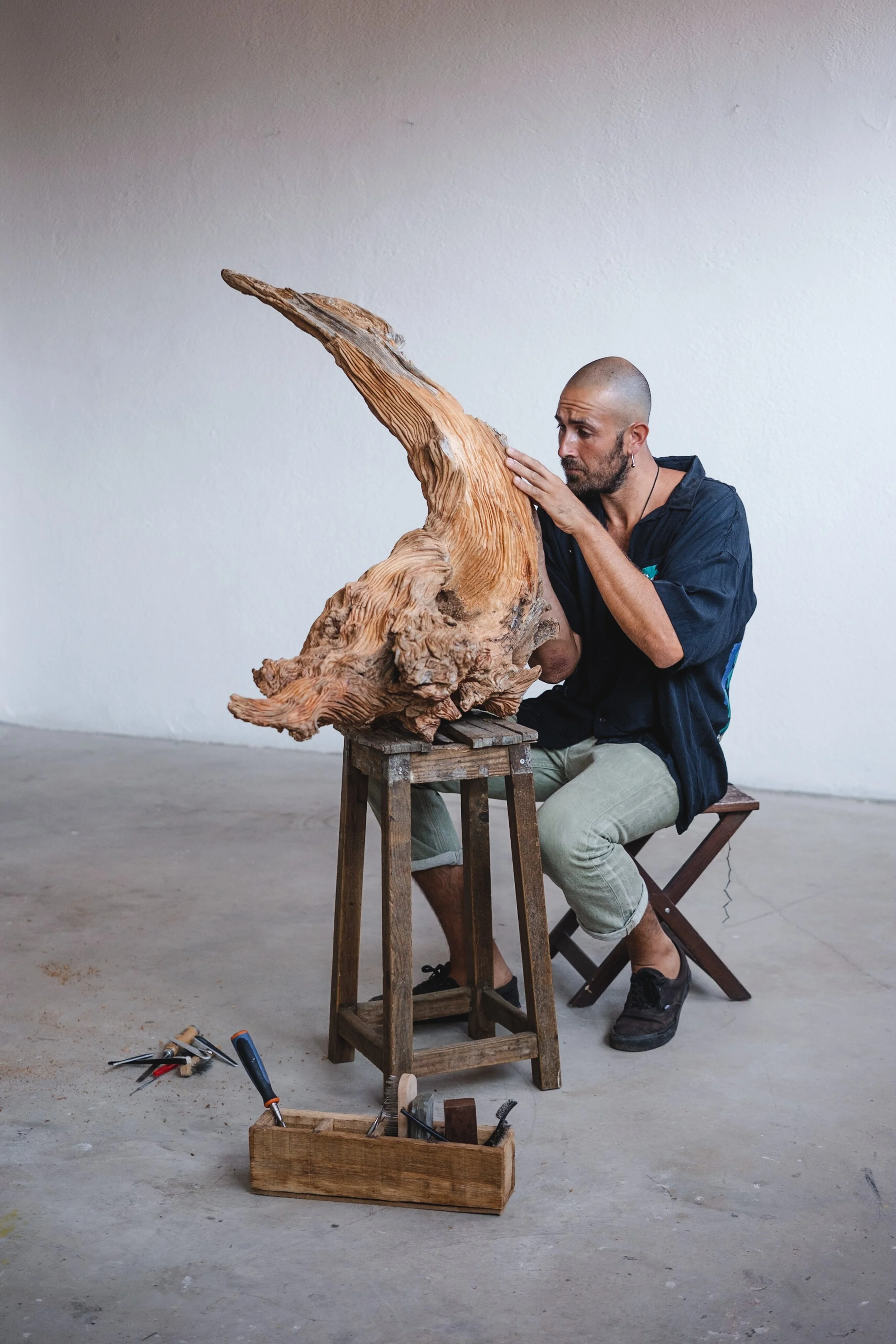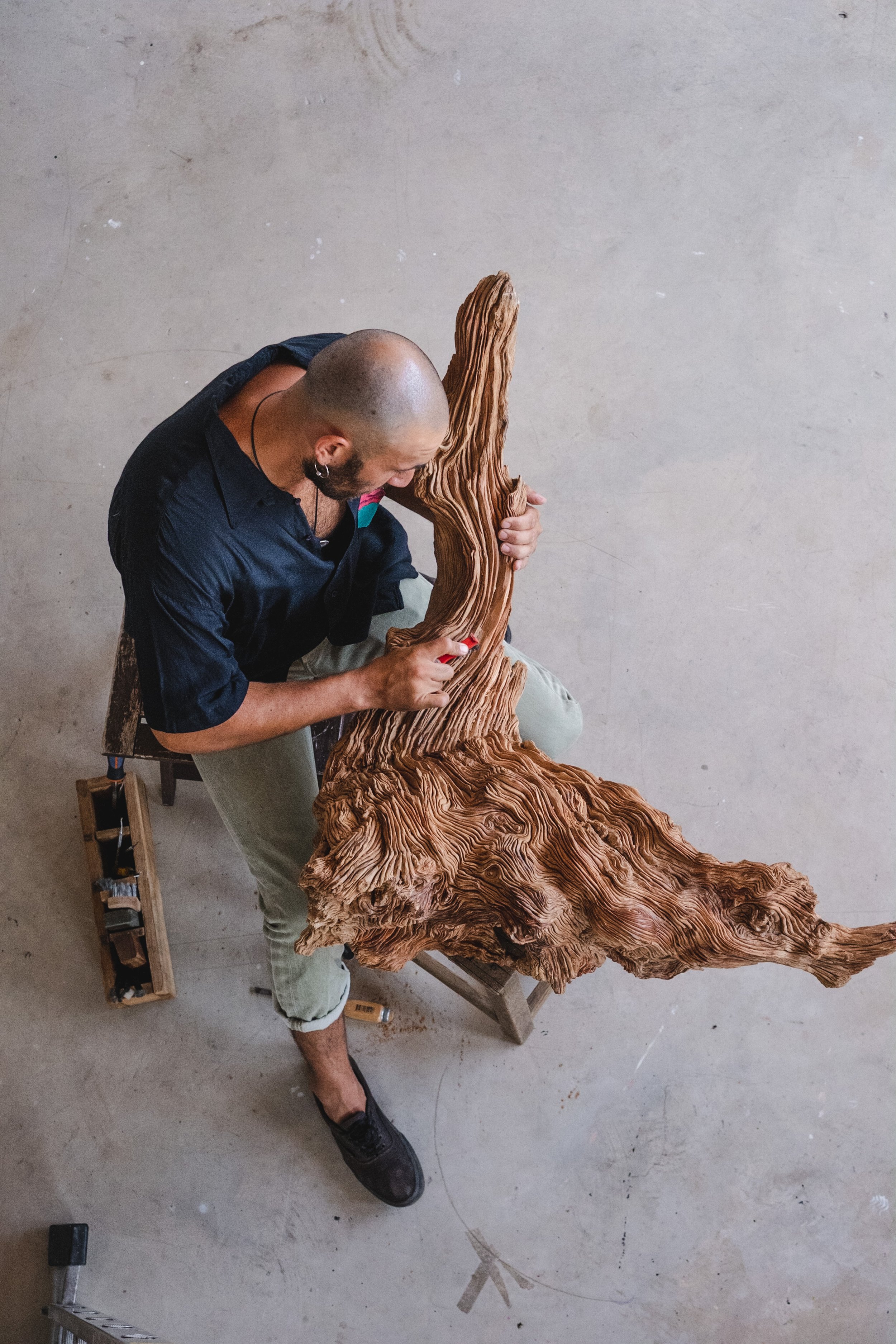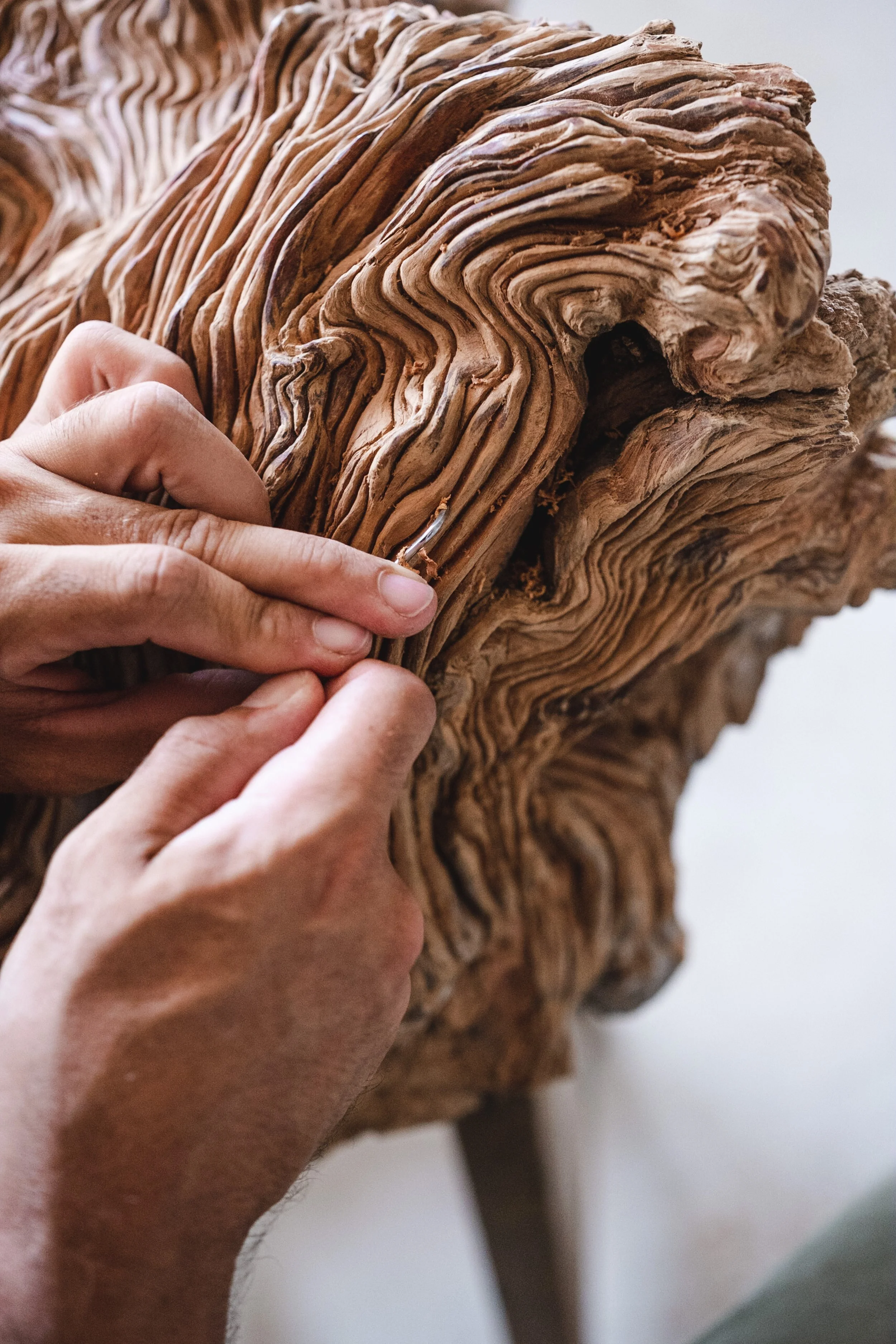 Back in his workshop, the pace slows even further. A single piece of wood may stay with him for years. He works into the secondary xylem—the tree’s memory bank—removing just enough to reveal its inner voice. He does not carve to impose; he waits, listens, and intervenes only when the material allows.