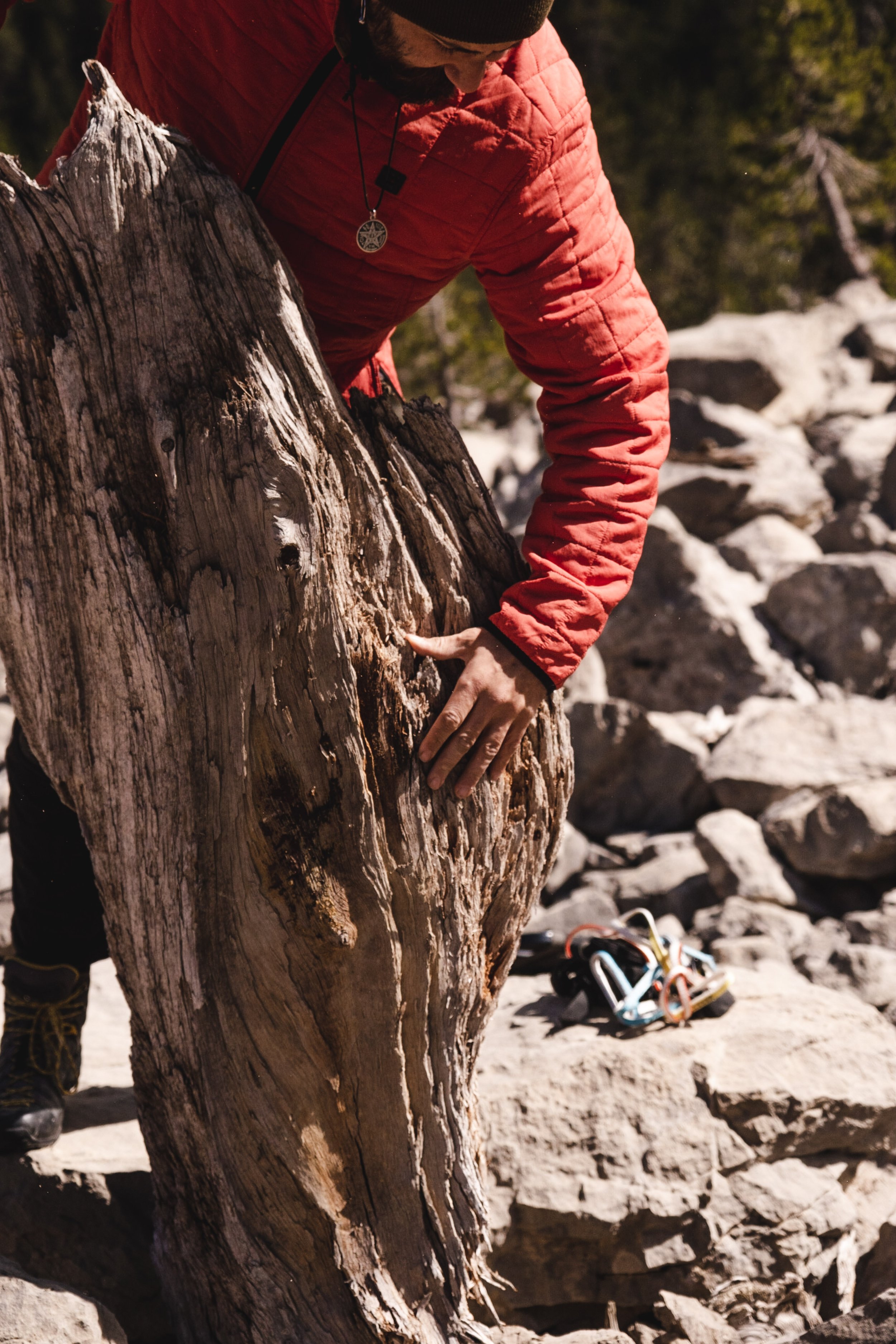 The story does not begin in a studio; it starts on a mountain trail, with Borja Cáceres (Barcelona, 1990) bent under the weight of a fragment of a dead tree strapped to his back. The wood is cracked, scarred, and worn by time. For most people, it would be considered a waste; for Cáceres, it is testimony.