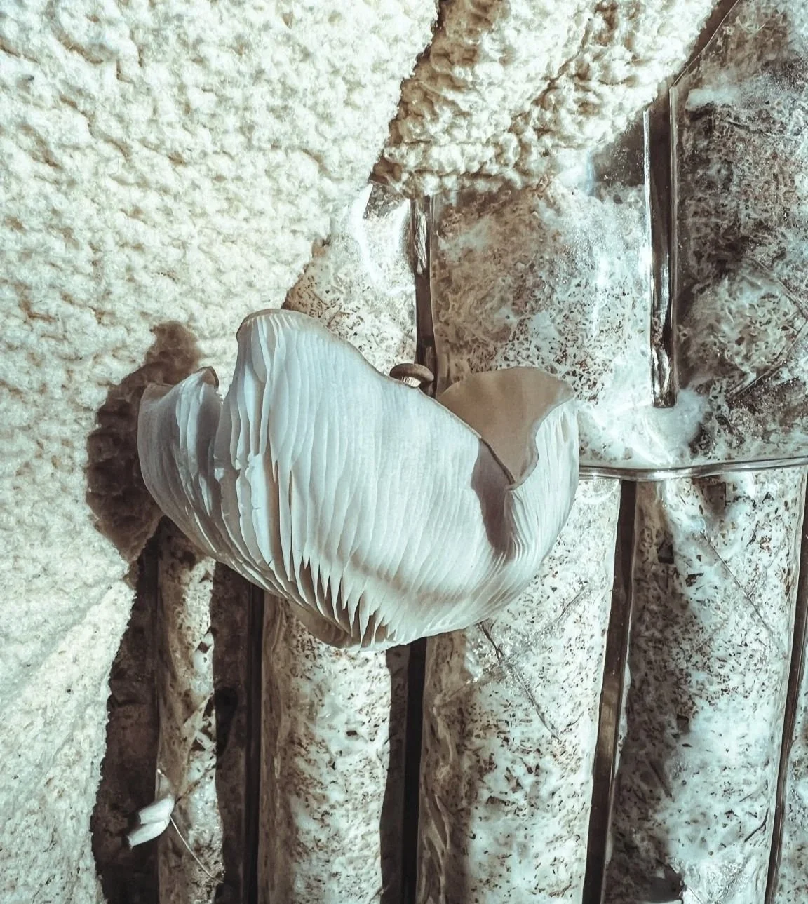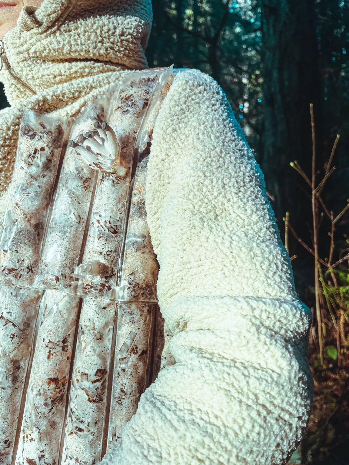 In Vested Fruits, a speculative mushroom vest developed in response to food insecurity and systemic instability, nourishment, mobility and material reuse converge within a single object. Constructed from blue oyster mushrooms, alder sawdust, shredded cardboard and discarded packaging, the piece reflects increasingly fragile food systems shaped by climate disruption, conflict, displacement and economic volatility.